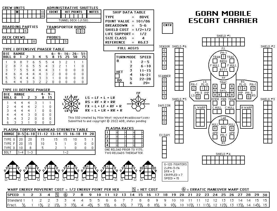 Mobile Escort Carrier (DWVE): The DWV has no disruptors, and the one disruptor it could have has already been replaced by a phaser. The ship is the same as the standard DWV, but aegis is added.